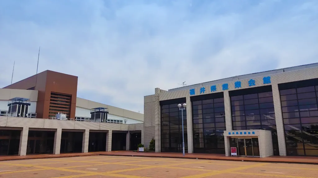 福井県産業会館(以下「産業会館」といいます。)は、福井県内最大の人口を抱える県庁所在地の福井市南東部に県下の産業の振興と発展の拠点として、1980年4月に開館しました。福井県を南北に縦貫する幹線道路の国道8号線沿いに位置し、JR福井駅から約15分で到着できるバス路線(無料バスもあり。)のバス停が産業会館に隣接されおり、交通アクセスに恵まれた立地環境にあります。